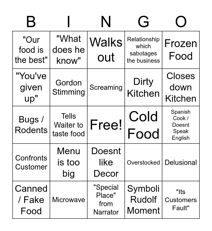This bingo card has a free space and 24 words: Menu is too big, Microwave, Screaming, Canned / Fake Food, Frozen Food, "Our food is the best", "You've given up", "What does he know", Cold Food, Doesnt like Decor, Dirty Kitchen, Bugs / Rodents, Overstocked, Delusional, Gordon Stimming, Symboli Rudolf Moment, Spanish Cook / Doesnt Speak English, Walks out, Closes down Kitchen, Tells Waiter to taste food, "Its Customers Fault", Confronts Customer, Relationship which sabotages the business and "Special Place" from Narrator.