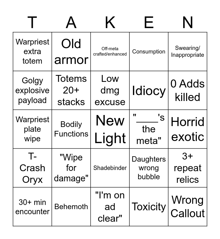 This bingo card has a free space and 24 words: "Wipe for damage", Behemoth, Low dmg excuse, 30+ min encounter, Swearing/ Inappropriate, Warpriest extra totem, Golgy explosive payload, Old armor, "____'s the meta", Shadebinder, Idiocy, Warpriest plate wipe, Daughters wrong bubble, 3+ repeat relics, Totems 20+ stacks, Toxicity, Horrid exotic, Off-meta crafted/enhanced, 0 Adds killed, Bodily Functions, Wrong Callout, T-Crash Oryx, Consumption and "I'm on ad clear".