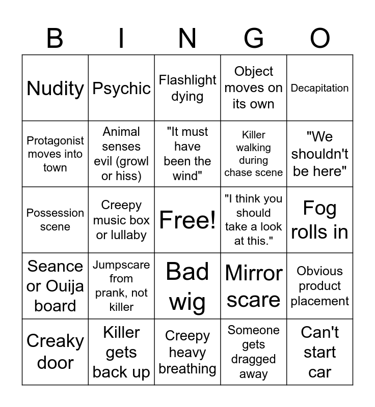 This bingo card has a free space and 25 words: Jumpscare from prank, not killer, Creepy heavy breathing, "It must have been the wind", Creaky door, Decapitation, Nudity, Protagonist moves into town, Psychic, "I think you should take a look at this.", Bad wig, Killer walking during chase scene, Possession scene, Mirror scare, Obvious product placement, Animal senses evil (growl or hiss), Road trip, Fog rolls in, Flashlight dying, "We shouldn't be here", Creepy music box or lullaby, Can't start car, Killer gets back up, Seance or Ouija board, Object moves on its own and Someone gets dragged away.