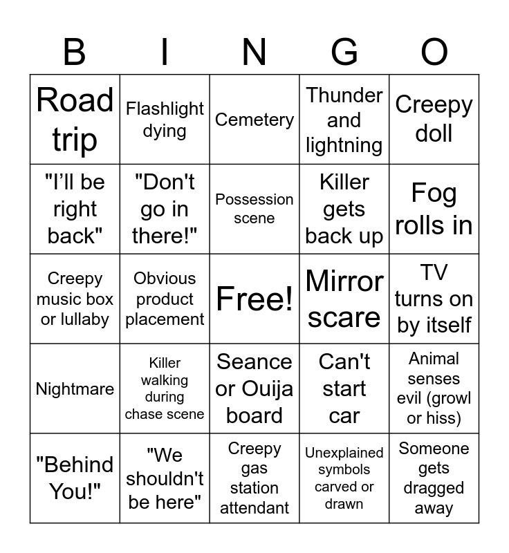 This bingo card has a free space and 25 words: Killer walking during chase scene, Creepy gas station attendant, Possession scene, "Behind You!", Creepy doll, Road trip, "I’ll be right back", Flashlight dying, Mirror scare, Seance or Ouija board, Killer gets back up, Creepy music box or lullaby, Can't start car, Animal senses evil (growl or hiss), "Don't go in there!", Object moves on its own, TV turns on by itself, Cemetery, Fog rolls in, Obvious product placement, Someone gets dragged away, "We shouldn't be here", Nightmare, Thunder and lightning and Unexplained symbols carved or drawn.