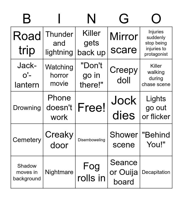 This bingo card has a free space and 24 words: Creaky door, Nightmare, "Don't go in there!", Shadow moves in background, Injuries suddenly stop being injuries to protagonist, Road trip, Jack-o'-lantern, Thunder and lightning, Jock dies, Disemboweling, Creepy doll, Drowning, Shower scene, "Behind You!", Watching horror movie, Seance or Ouija board, Lights go out or flicker, Killer gets back up, Killer walking during chase scene, Phone doesn't work, Decapitation, Cemetery, Mirror scare and Fog rolls in.