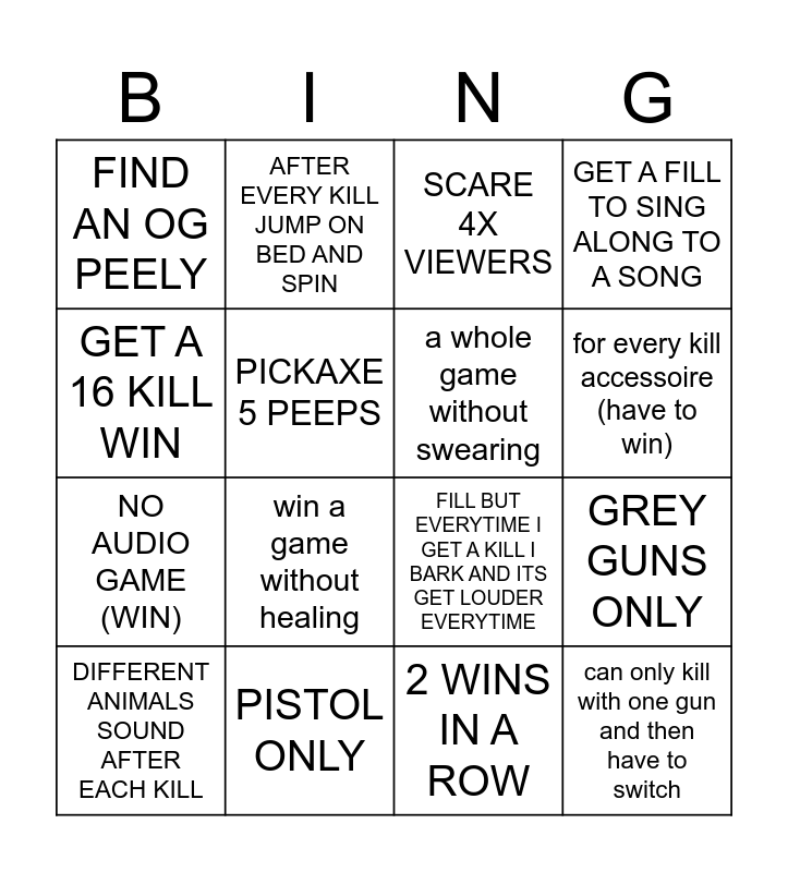 This bingo card has 16 words: PISTOL ONLY, GREY GUNS ONLY, SCARE 4X VIEWERS, FIND AN OG PEELY, NO AUDIO GAME (WIN), AFTER EVERY KILL JUMP ON BED AND SPIN, FILL BUT EVERYTIME I GET A KILL I BARK AND ITS GET LOUDER EVERYTIME, 2 WINS IN A ROW, GET A 16 KILL WIN, PICKAXE 5 PEEPS, DIFFERENT ANIMALS SOUND AFTER EACH KILL, GET A FILL TO SING ALONG TO A SONG, win a game without healing, for every kill accessoire (have to win), a whole game without swearing and can only kill with one gun and then have to switch.