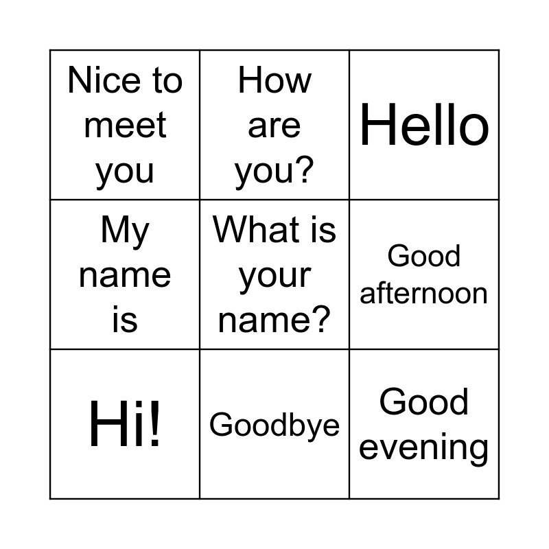 This bingo card has a free space and 9 words: Hi!, Hello, How are you?, My name is, Nice to meet you, Good afternoon, Good evening, Good morning and Goodbye.