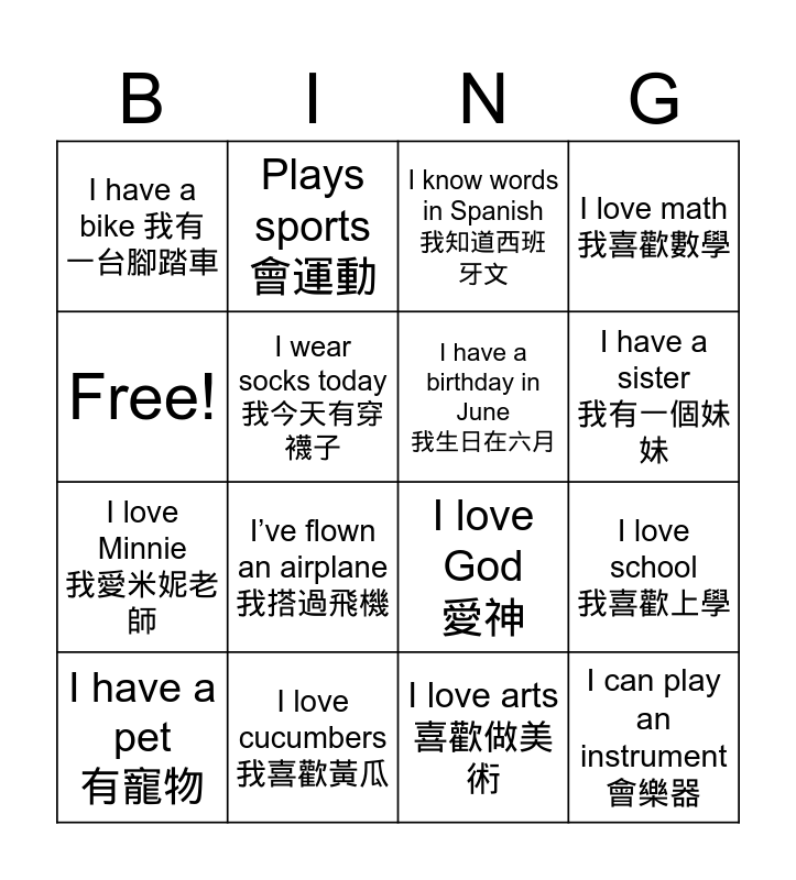 This bingo card has 16 words: I love cucumbers 我喜歡黃瓜, I love school 我喜歡上學, I know words in Spanish 我知道西班牙文, I have a bike 我有一台腳踏車, I love Minnie 我愛米妮老師, Plays sports 會運動, I love God 愛神, I love arts 喜歡做美術, Free!, I wear socks today 我今天有穿襪子, I have a pet 有寵物, I love math 我喜歡數學, I’ve flown an airplane 我搭過飛機, I have a sister 我有一個妹妹, I have a birthday in June 我生日在六月 and I can play an instrument 會樂器.