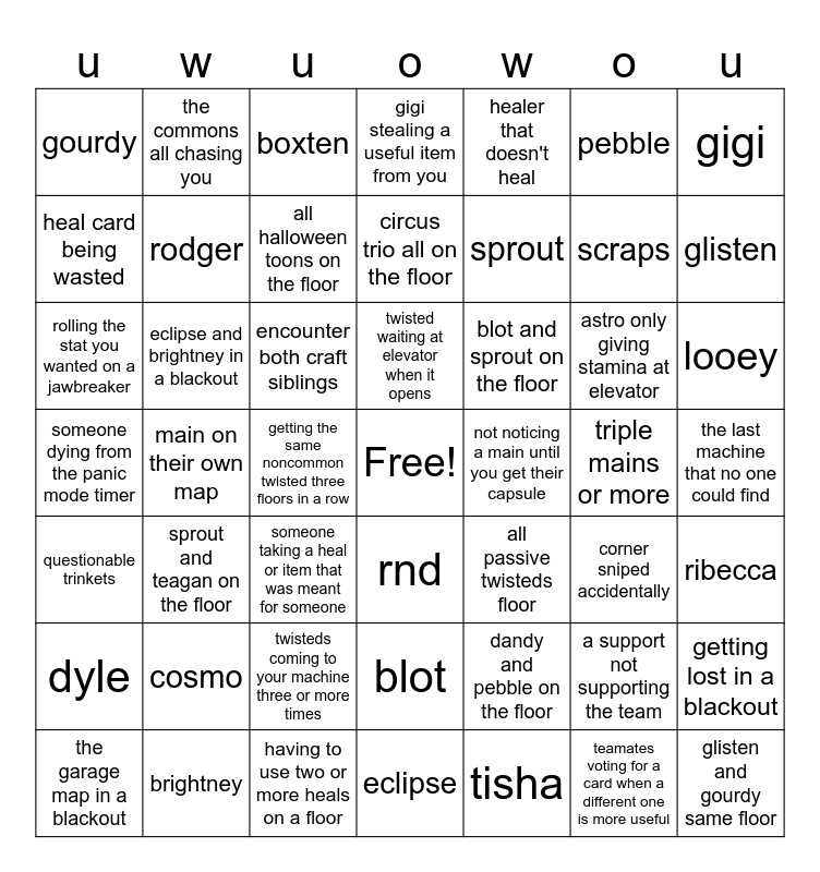 This bingo card has a free space and 83 words: astro, blot, boxten, brightney, brusha, connie, cosmo, dandy, dyle, eclipse, finn, flutter, gigi, glisten, goob, gourdy, looey, pebble, poppy, rnd, ribecca, rodger, scraps, soulvester, sprout, teagan, tisha, toodles, yatta, see same main three times, encounter both craft siblings, encounter both ghost siblings, all passive twisteds floor, circus trio all on the floor, glisten and gourdy same floor, triple mains or more, main on their own map, vee, all halloween toons on the floor, eclipse and brightney in a blackout, sprout and teagan on the floor, corner sniped accidentally, dandy selling three of the same item, dandy selling useful items on floor one, the garage map in a blackout, getting lost in a blackout, the commons all chasing you, dandy and pebble on the floor, dyle in a blackout, accidentally leading the twisted to a teamate, blot and sprout on the floor, gigi stealing a useful item from you, rolling the stat you wanted on a jawbreaker, dyle card on floor nine, someone getting hit by a passive twisted, someone dies before floor five, someone taking a heal or item that was meant for someone, distractor that doesn't know how to properly distract, someone dying from the panic mode timer, someone getting hit from getting out the elevator, twisteds coming to your machine three or more times, half the team dies one specific floor, entitled healer, healer that doesn't heal, support toon never supporting the team, astro only giving stamina at elevator, getting a useful item from blind grab, questionable trinkets, dog plush on a slow toon, fancy purse trinket, stealth candy and stopwatch in shop, a support not supporting the team, finn and toodles in a blackout, twisted waiting at elevator when it opens, getting the same noncommon twisted three floors in a row, making it to floor 20 or higher, teamates voting for a card when a different one is more useful, heal card being wasted, the last machine that no one could find, not noticing a main until you get their capsule, having to use two or more heals on a floor, you or someone else being on one heart for three floors and accidentally opening rodger.