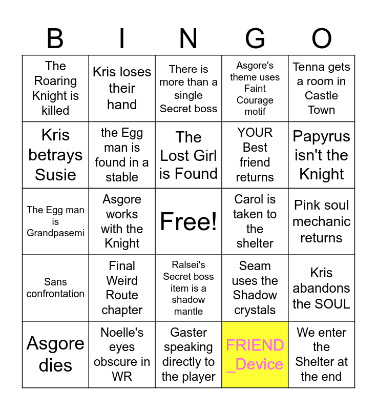 This bingo card has a free space and 24 words: Asgore dies, Final Weird Route chapter, The Lost Girl is Found, FRIEND _Device, Tenna gets a room in Castle Town, The Roaring Knight is killed, Kris loses their hand, There is more than a single Secret boss, Carol is taken to the shelter, Pink soul mechanic returns, The Egg man is Grandpasemi, the Egg man is found in a stable, Seam uses the Shadow crystals, Kris abandons the SOUL, Kris betrays Susie, Noelle's eyes obscure in WR, Gaster speaking directly to the player, Asgore's theme uses Faint Courage motif, Papyrus isn't the Knight, Sans confrontation, Asgore works with the Knight, Ralsei's Secret boss item is a shadow mantle, YOUR Best friend returns and We enter the Shelter at the end.