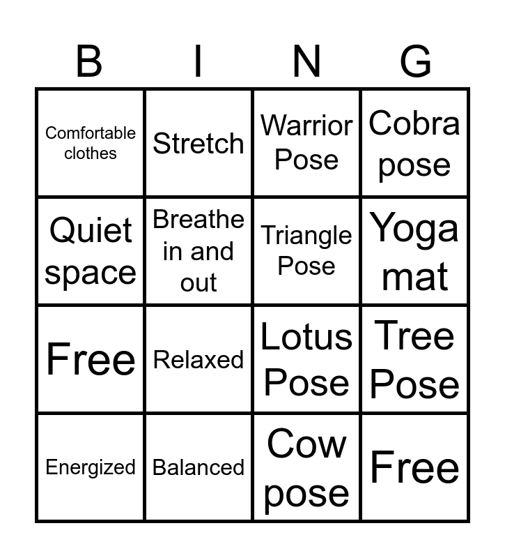 This bingo card has 23 words: Free, Yoga block, Yoga mat, Water bottle, Quiet space, Comfortable clothes, Breathe in and out, Stretch, Energized, Strong, Relaxed, Free, Peaceful, Focused, Balanced, Dog Pose, Warrior Pose, Lotus Pose, Triangle Pose, Tree Pose, Cobra pose, Cow pose and Cat pose.