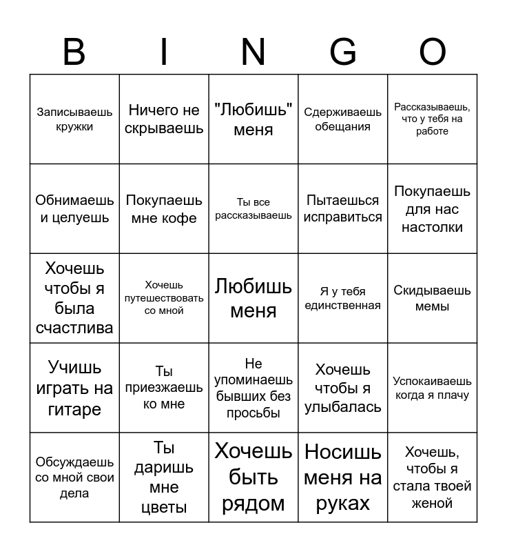 This bingo card has a free space and 24 words: Ты приезжаешь ко мне, Ты даришь мне цветы, Ты все рассказываешь, Обсуждаешь со мной свои дела, Рассказываешь, что у тебя на работе, Записываешь кружки, Обнимаешь и целуешь, Ничего не скрываешь, Я у тебя единственная, Не упоминаешь бывших без просьбы, Пытаешься исправиться, Хочешь чтобы я была счастлива, Хочешь чтобы я улыбалась, Успокаиваешь когда я плачу, Покупаешь мне кофе, Носишь меня на руках, Скидываешь мемы, "Любишь" меня, Покупаешь для нас настолки, Хочешь путешествовать со мной, Хочешь, чтобы я стала твоей женой, Учишь играть на гитаре, Сдерживаешь обещания and Хочешь быть рядом.