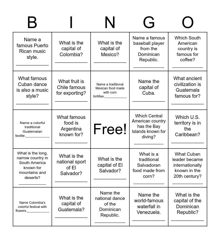 This bingo card has a free space and 33 words: Name the dance that originated in Argentina. ____________, What is the capital of Argentina?____________, What famous food is Argentina known for?____________, Name a famous Chilean poet who won the Nobel Prize. ____________, What is the long, narrow country in South America known for mountains and deserts? ____________, What fruit is Chile famous for exporting?____________, Which South American country is famous for coffee? ____________, Name Colombia’s colorful festival with flowers.____________, What is the capital of Colombia? ____________, What holiday involves building altars and honoring deceased loved ones? ____________, Name a traditional Mexican food made with corn tortillas.____________, What is the capital of Mexico? ____________, Name a popular traditional Honduran dish. ____________, What is the capital of Honduras? ____________, Which Central American country has the Bay Islands known for diving? ____________, What ancient civilization is Guatemala famous for? ____________, What is the capital of Guatemala?____________, Name a colorful traditional Guatemalan textile.____________, What is the national sport of El Salvador? ____________, What is a traditional Salvadoran food made from corn? ____________, What is the capital of El Salvador?____________, What is the capital of Puerto Rico? ____________, Name a famous Puerto Rican music style. ____________, Which U.S. territory is in the Caribbean? ____________, Name the national dance of the Dominican Republic. ____________, What is the capital of the Dominican Republic? ____________, Name a famous baseball player from the Dominican Republic. ____________, Name the capital of Cuba. ____________, What famous Cuban dance is also a music style? ____________, What Cuban leader became internationally known in the 20th century? ____________, What is the capital of Venezuela? ____________, Name the world-famous waterfall in Venezuela. ____________ and What is Venezuela famous for producing? ____________.
