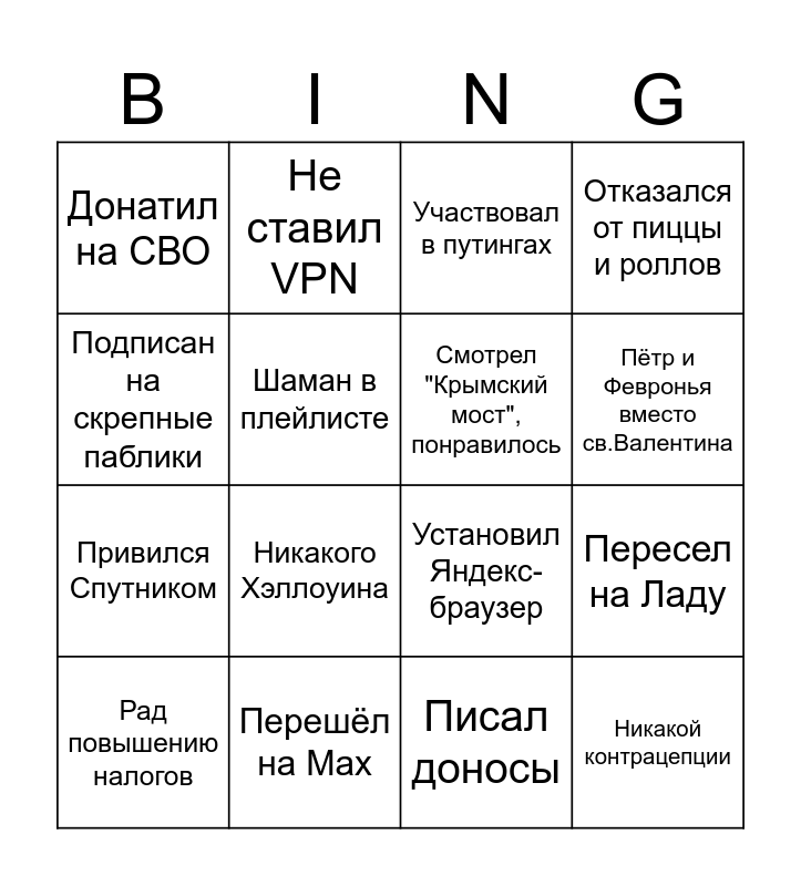 This bingo card has 16 words: Перешёл на Max, Пересел на Ладу, Участвовал в путингах, Донатил на СВО, Привился Спутником, Не ставил VPN, Установил Яндекс-браузер, Писал доносы, Подписан на скрепные паблики, Шаман в плейлисте, Рад повышению налогов, Отказался от пиццы и роллов, Никакого Хэллоуина, Пётр и Февронья вместо св.Валентина, Смотрел "Крымский мост", понравилось and Никакой контрацепции.