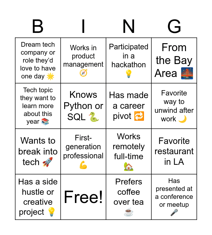 This bingo card has 28 words: Works in data analytics π, Has switched careers into tech π, Wants to break into tech π, Has attended a coding bootcamp π©βπ», Knows Python or SQL π, Participated in a hackathon π‘, Works in product management π§, Has presented at a conference or meetup π€, Free!, Planning to attend another Tech Week event π , Works remotely full-time π‘, From the Bay Area π, From outside California βοΈ, Speaks more than two languages π, First-generation professional πͺ, Favorite tech product or app right now π±, Met a friend through Latinas in Tech π€, Has made a career pivot π, Favorite way to unwind after work π, Favorite tech podcast or YouTube channel π§, Dream tech company or role theyβd love to have one day π, Someone whoβs traveled abroad for work or study π, Has a side hustle or creative project π‘, Favorite restaurant in LA, Prefers coffee over tea β, Favorite Latina role model or inspiration π, Tech topic they want to learn more about this year π and One piece of advice theyβd give their younger self π«.