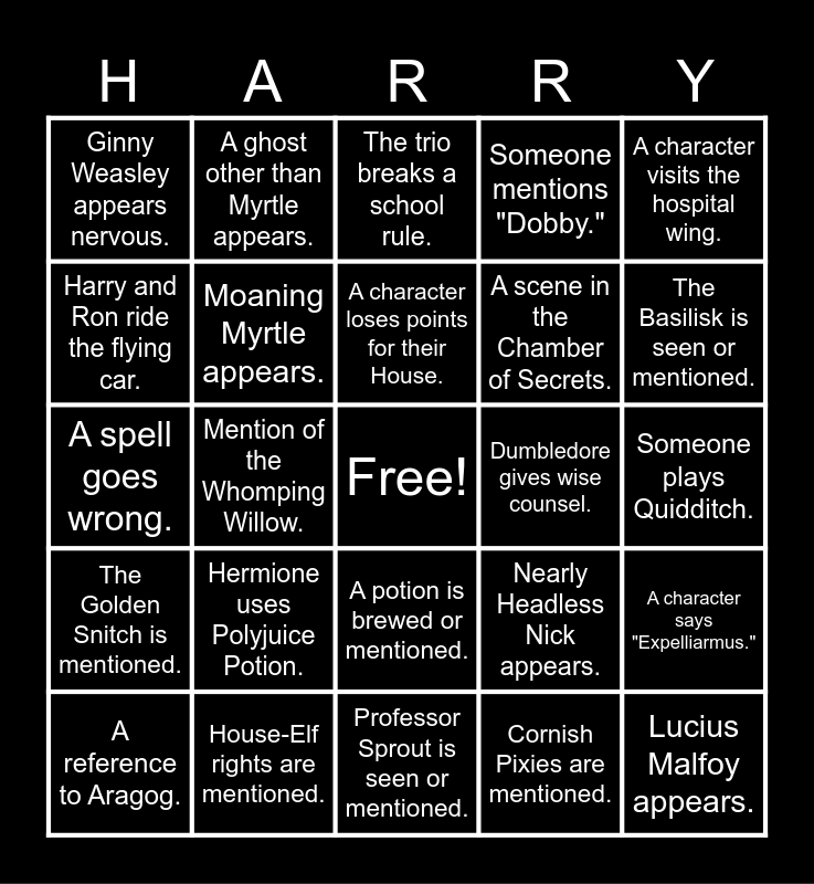 This bingo card has a free space and 60 words: Harry speaks Parseltongue., Hermione uses Polyjuice Potion., A character mentions "Muggle-borns.", Ron's wand malfunctions., Someone plays Quidditch., Hagrid gives advice., Moaning Myrtle appears., A scene in the Forbidden Forest., Dumbledore gives wise counsel., Gilderoy Lockhart boasts about himself., Harry and Ron ride the flying car., The term "Heir of Slytherin" is mentioned., A scene in the Chamber of Secrets., The Sorting Hat appears., Mention of Tom Riddle's diary., A ghost other than Myrtle appears., A character loses points for their House., Someone mentions "Dobby.", Snape looks suspicious., A spell goes wrong., Mention of the Whomping Willow., The trio breaks a school rule., A scene in the Great Hall., The Basilisk is seen or mentioned., Harry uses the Invisibility Cloak., A character receives a Howler., A potion is brewed or mentioned., The Ford Anglia is seen., A character visits the hospital wing., A scene in McGonagall's classroom., Harry gets a detention., The Dueling Club is mentioned or shown., A scene in the Slytherin common room., The Weasley's Burrow is shown., Ginny Weasley appears nervous., A mention of "Mandrakes.", Colin Creevey takes a photo., Nearly Headless Nick appears., A scene in Hagrid's hut., The Golden Snitch is mentioned., The Sword of Gryffindor is referenced., Professor Sprout is seen or mentioned., Cornish Pixies are mentioned., The Deathday Party is mentioned., A scene in the library., Professor Flitwick appears., A character mentions "Petrification.", The Mirror of Erised is mentioned., Fawkes the Phoenix is mentioned., A reference to Aragog., House-Elf rights are mentioned., A character uses a broomstick., Mention of "Parseltongue.", Lucius Malfoy appears., Reference to the previous year's events., Someone uses Floo Powder., A scene involving a spell book., Reference to Gryffindor House., A character says "Expelliarmus." and A scene with Professor Lockhart teaching..