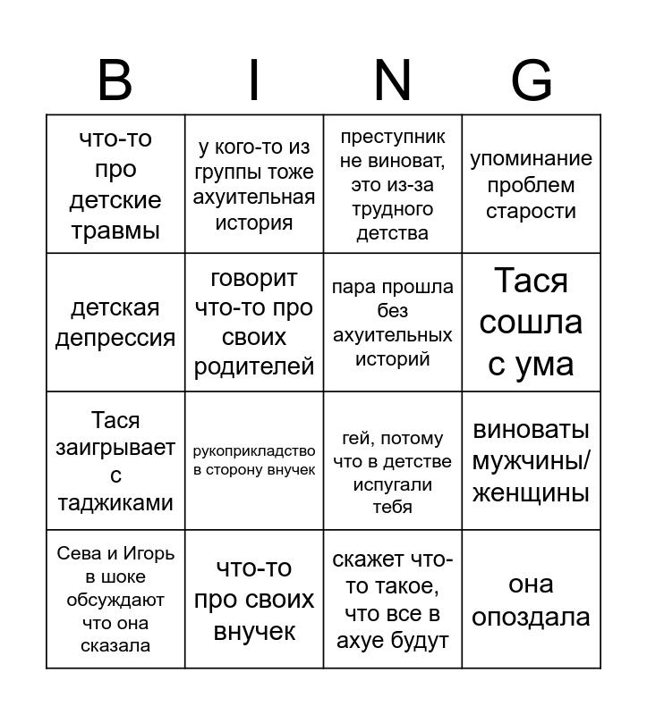 This bingo card has 16 words: что-то про своих внучек, виноваты мужчины/женщины, преступник не виноват, это из-за трудного детства, что-то про детские травмы, Тася заигрывает с таджиками, у кого-то из группы тоже ахуительная история, гей, потому что в детстве испугали тебя, скажет что-то такое, что все в ахуе будут, детская депрессия, говорит что-то про своих родителей, Сева и Игорь в шоке обсуждают что она сказала, упоминание проблем старости, рукоприкладство в сторону внучек, Тася сошла с ума, пара прошла без ахуительных историй and она опоздала.