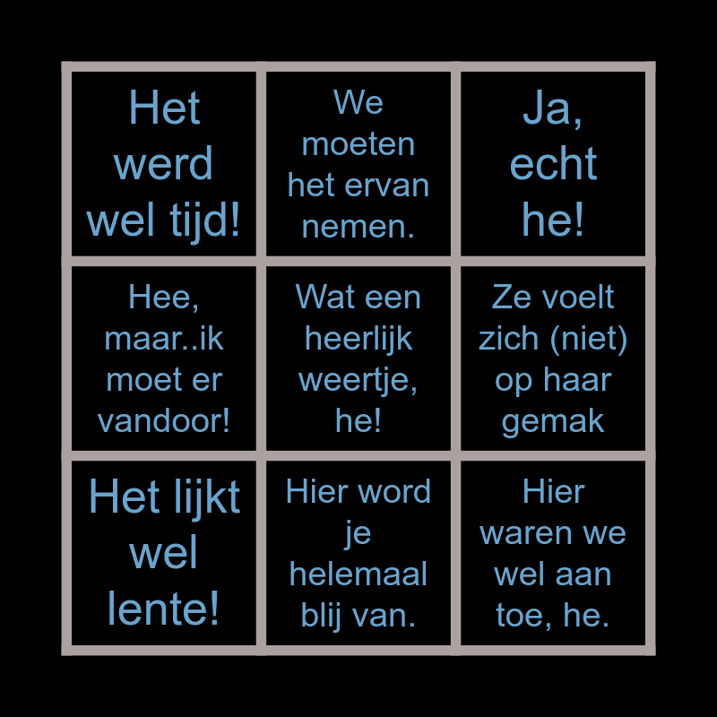 This bingo card has a free space and 8 words: Ze voelt zich (niet) op haar gemak, Ja, echt he!, We moeten het ervan nemen., Het lijkt wel lente!, Het werd wel tijd!, Hier waren we wel aan toe, he., Hee, maar..ik moet er vandoor! and Hier word je helemaal blij van..