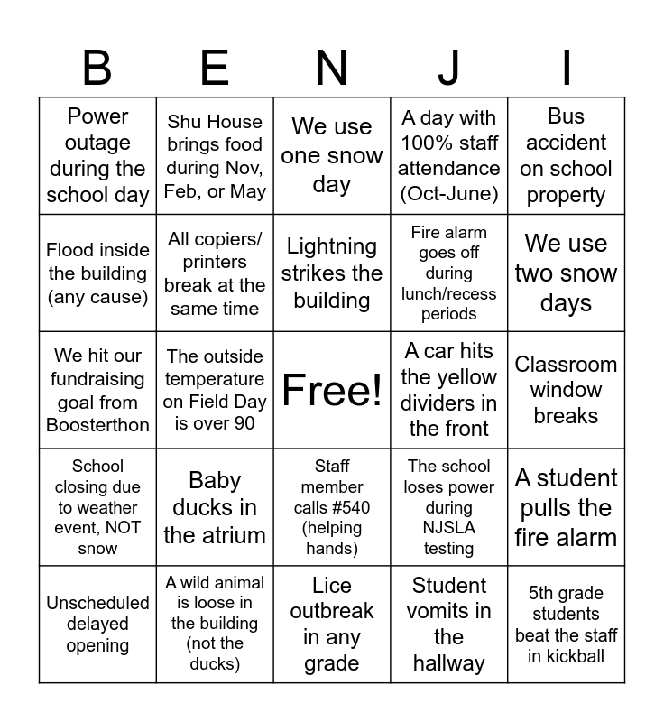 This bingo card has a free space and 24 words: Baby ducks in the atrium, A wild animal is loose in the building (not the ducks), Lightning strikes the building, Unscheduled delayed opening, Bus accident on school property, Power outage during the school day, Flood inside the building (any cause), Shu House brings food during Nov, Feb, or May, A car hits the yellow dividers in the front, Staff member calls #540 (helping hands), Fire alarm goes off during lunch/recess periods, We hit our fundraising goal from Boosterthon, The school loses power during NJSLA testing, A student pulls the fire alarm, All copiers/ printers break at the same time, Student vomits in the hallway, Classroom window breaks, We use one snow day, We use two snow days, The outside temperature on Field Day is over 90, 5th grade students beat the staff in kickball, School closing due to weather event, NOT snow, A day with 100% staff attendance (Oct-June) and Lice outbreak in any grade.