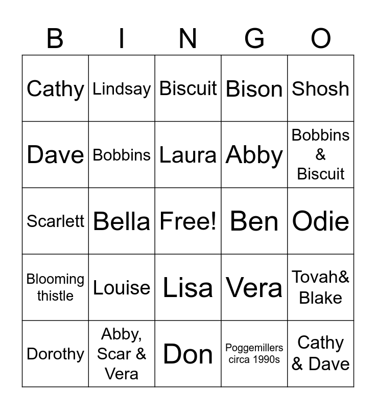 This bingo card has a free space and 25 words: Louise, Don, Laura, Dorothy, Shosh, Cathy, Dave, Lindsay, Ben, Lisa, Abby, Scarlett, Vera, Tovah& Blake, Bobbins, Buddy in a Box, Odie, Biscuit, Bobbins & Biscuit, Bella, Cathy & Dave, Abby, Scar & Vera, Blooming thistle, Bison and Poggemillers circa 1990s.