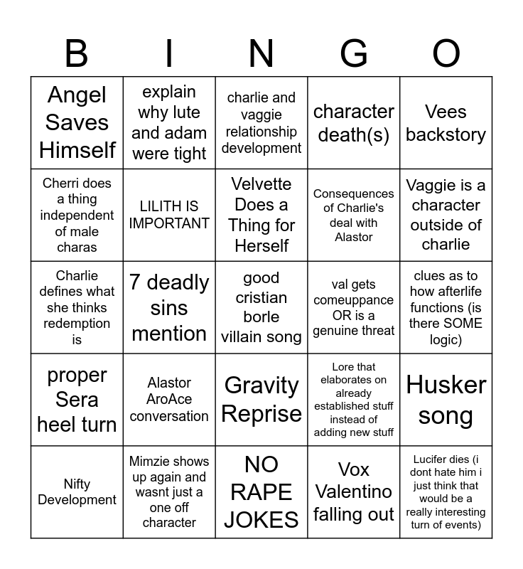 This bingo card has a free space and 24 words: Nifty Development, Alastor AroAce conversation, Velvette Does a Thing for Herself, Vox Valentino falling out, Vees backstory, Angel Saves Himself, explain why lute and adam were tight, charlie and vaggie relationship development, val gets comeuppance OR is a genuine threat, clues as to how afterlife functions (is there SOME logic), Charlie defines what she thinks redemption is, LILITH IS IMPORTANT, Lore that elaborates on already established stuff instead of adding new stuff, Husker song, Cherri does a thing independent of male charas, Mimzie shows up again and wasnt just a one off character, NO RAPE JOKES, character death(s), Vaggie is a character outside of charlie, proper Sera heel turn, 7 deadly sins mention, Gravity Reprise, Consequences of Charlie's deal with Alastor and Lucifer dies (i dont hate him i just think that would be a really interesting turn of events).
