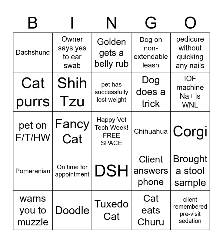 This bingo card has a free space and 30 words: Doodle, Lab eats treats, Fancy Cat, German Shepherd, Dachshund, Golden gets a belly rub, Shih Tzu, DSH, Chihuahua, Tuxedo Cat, Corgi, client remembered pre-visit sedation, Cat eats Churu, Client says "Please", IOF machine Na+ is WNL, CBC with no flags, Client answers phone, Pomeranian, On time for appointment, pedicure without quicking any nails, pet on F/T/HW, owner brushes teeth, Owner says yes to ear swab, Dog does a trick, Cat purrs, Dog on non-extendable leash, Brought a stool sample, warns you to muzzle, pet has successfully lost weight and says yes to drop off appointment.