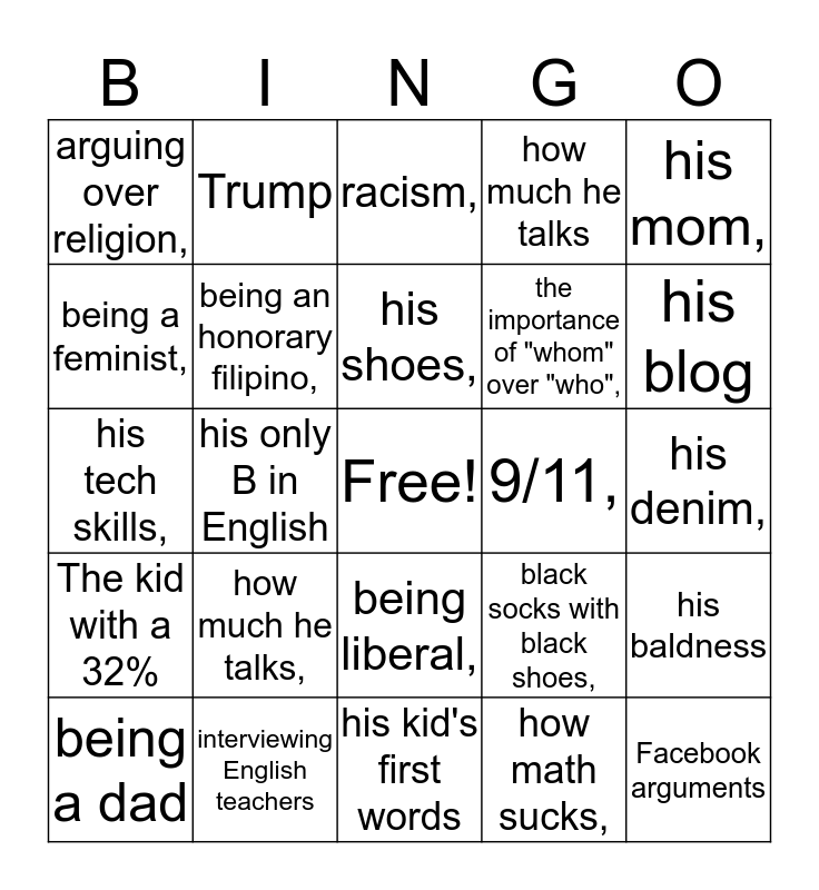 This bingo card has a free space and 24 words: how much he talks,, interviewing English teachers, his shoes,, being a dad, his mom,, arguing over religion,, being a feminist,, Trump, 9/11,, being liberal,, the importance of "whom" over "who",, his tech skills,, black socks with black shoes,, his baldness, being an honorary filipino,, how math sucks,, his denim,, racism,, his blog, his only B in English, Facebook arguments, The kid with a 32%, how much he talks and his kid's first words.