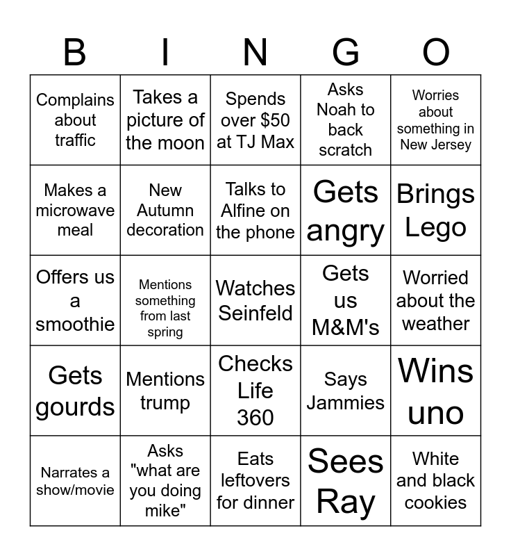 This bingo card has a free space and 24 words: Narrates a show/movie, Mentions trump, Talks to Alfine on the phone, Sees Ray, Worries about something in New Jersey, Complains about traffic, Takes a picture of the moon, Spends over $50 at TJ Max, Gets us M&M's, Worried about the weather, Offers us a smoothie, New Autumn decoration, Says Jammies, Wins uno, Makes a microwave meal, Asks "what are you doing mike", Eats leftovers for dinner, Asks Noah to back scratch, Brings Lego, Gets gourds, Mentions something from last spring, Checks Life 360, Gets angry and White and black cookies.