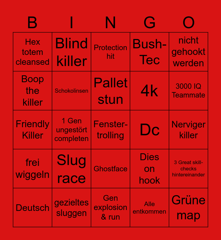 This bingo card has 40 words: Mori, Friendly Killer, Hatch escape, Schokolinsen, gezieltes sluggen, Ghostface, Pallet stun, am Haken geschlagen, nicht gehookt werden, frei wiggeln, 1 Gen ungestört completen, Bush-Tec, Fenster-trolling, Nerviger killer, Dc, Slug race, Gen wird geblockt, Hex totem cleansed, Killer wird gemobbt, Protection hit, 3 Great skill-checks hintereinander, Alle entkommen, 4k, Boop the killer, Scream, Teammate öffnet gate, Funny, Claudette/Dwight gameplay, Grüne map, Sable/Meg, Selfcare, Deutsch, Wtf is that Build, Dies on hook, 3000 IQ Teammate, Gen explosion & run, chase escape, toxic endgame chat, Blind killer and Indoor map.