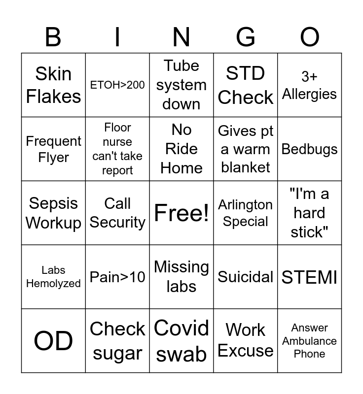 This bingo card has a free space and 27 words: Suicidal, AMA, Gives pt a warm blanket, Covid swab, Frequent Flyer, Tube system down, ETOH>200, Labs Hemolyzed, Arlington Special, STEMI, Sepsis Workup, STD Check, OD, Check sugar, Bedbugs, Stinky feet, Floor nurse can't take report, No Ride Home, Pain>10, Skin Flakes, "I'm a hard stick", Work Excuse, Call Security, Answer Ambulance Phone, Missing labs, 3+ Allergies and Cussed out by pt.