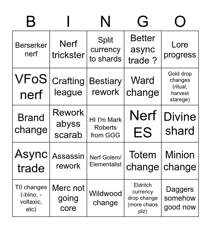 This bingo card has a free space and 24 words: Assassin rework, Merc not going core, Bestiary rework, T0 changes (-bino, -voltaxic, etc), Lore progress, Berserker nerf, VFoS nerf, Nerf trickster, Nerf ES, Nerf Golem/ Elementalist, Ward change, Brand change, Totem change, Minion change, Crafting league, Eldritch currency drop change (more chaos plz), Divine shard, Split currency to shards, Gold drop changes (ritual, harvest starege), Rework abyss scarab, Daggers somehow good now, Async trade, Better async trade ? and Wildwood change.