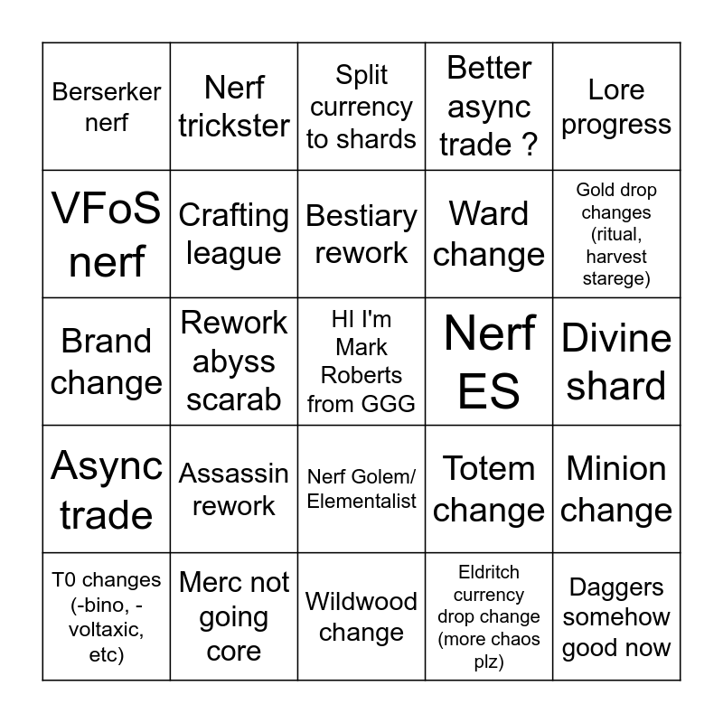 This bingo card has a free space and 24 words: Assassin rework, Merc not going core, Bestiary rework, T0 changes (-bino, -voltaxic, etc), Lore progress, Berserker nerf, VFoS nerf, Nerf trickster, Nerf ES, Nerf Golem/ Elementalist, Ward change, Brand change, Totem change, Minion change, Crafting league, Eldritch currency drop change (more chaos plz), Divine shard, Split currency to shards, Gold drop changes (ritual, harvest starege), Rework abyss scarab, Daggers somehow good now, Async trade, Better async trade ? and Wildwood change.