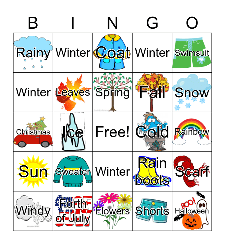 This bingo card has 24 images, a free space and 29 words: Winter, Forth of July, Coat, Hot, Swimsuit, Rainy, Leaves, Spring, Cold, Scarf, Windy, Ice, Shorts, Halloween, Christmas, Summer, Flowers, Rain boots, Snow, Sun, Sweater, St. Patrick's Day, Fall, Rainbow, Winter, Winter, Winter, Winter and Winter.