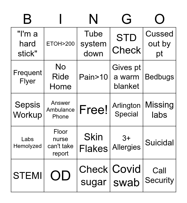 This bingo card has a free space and 28 words: Suicidal, AMA, Gives pt a warm blanket, Covid swab, Frequent Flyer, Tube system down, ETOH>200, Labs Hemolyzed, Arlington Special, STEMI, Sepsis Workup, STD Check, OD, Check sugar, Bedbugs, Stinky feet, Floor nurse can't take report, No Ride Home, Pain>10, Skin Flakes, "I'm a hard stick", Work Excuse, Call Security, Answer Ambulance Phone, Missing labs, 3+ Allergies, Cussed out by pt and Fairfield 2512.