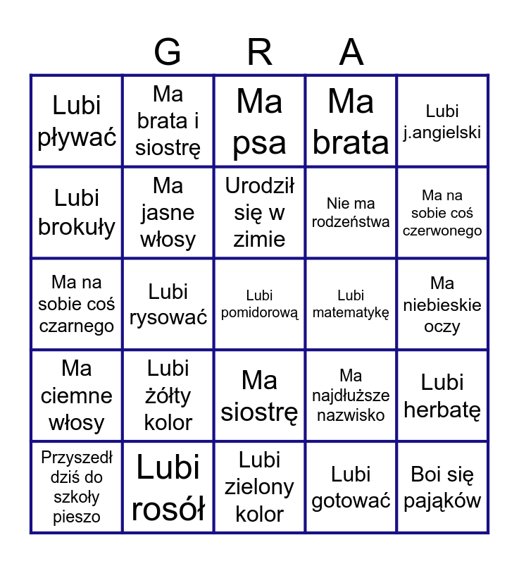 This bingo card has 36 words: Free!, Lubi biegać, Lubi śpiewać, Urodził się w zimie, Ma najdłuższe nazwisko, Boi się pająków, Lubi brokuły, Ma najdłuższe imię, Ma psa, Ma kota, Ma niebieskie oczy, Lubi pływać, Lubi żółty kolor, Lubi zielony kolor, Lubi matematykę, Lubi j.angielski, Przyszedł dziś do szkoły pieszo, Ma brata i siostrę, Ma siostrę, Ma brata, Lubi herbatę, Ma ciemne włosy, Ma jasne włosy, Ma sznurowane buty, Lubi gotować, Ma na sobie coś czerwonego, Ma na sobie coś czarnego, Lubi rosół, Lubi pomidorową, Nie ma rodzeństwa, Mieszka w domu z ogrodem, Mieszka poza Białą, Lubi rysować, Lubi czytać, Lubi tańczyć and Gra na instrumencie.