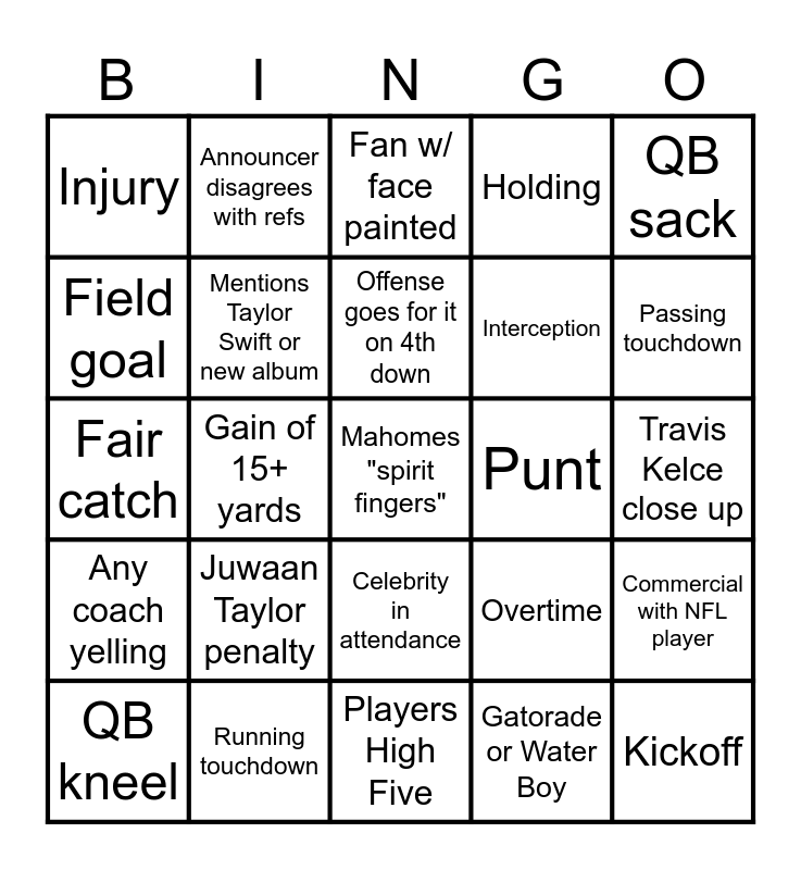 This bingo card has 38 words: Free!, Field goal in the Red Zone, Missed extra point, Mentions Taylor Swift or new album, Commercial with NFL player, Juwaan Taylor penalty, Offense goes for it on 4th down, Touchdown celebration, QB sack, Interception, Gain of 15+ yards, Holding, Mahomes "spirit fingers", Travis Kelce close up, Field goal, Any coach yelling, Beer commercial, Fan w/ face painted, Incomplete pass, Punt, Injury, Running touchdown, Passing touchdown, QB kneel, Cheerleaders, Players High Five, Kickoff, Delay of game, Booing @ referee, QB Blitz, Extra point, Celebrity in attendance, Gatorade or Water Boy, Announcer disagrees with refs, Little Caesar's commercial, Overtime, Fair catch and Pass interference.
