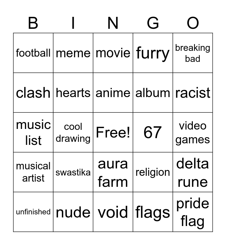 This bingo card has a free space and 24 words: swastika, nude, anime, unfinished, breaking bad, football, clash, meme, 67, aura farm, album, music list, religion, delta rune, hearts, flags, video games, movie, racist, cool drawing, pride flag, musical artist, furry and void.
