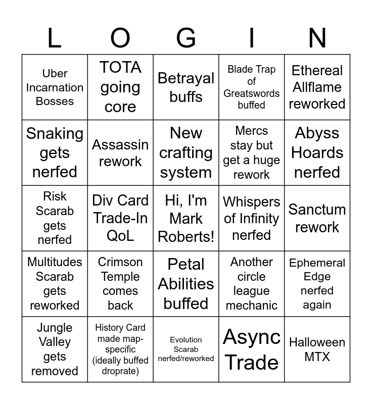This bingo card has a free space and 24 words: Crimson Temple comes back, History Card made map-specific (ideally buffed droprate), New crafting system, Jungle Valley gets removed, Ethereal Allflame reworked, Uber Incarnation Bosses, Snaking gets nerfed, TOTA going core, Whispers of Infinity nerfed, Petal Abilities buffed, Mercs stay but get a huge rework, Risk Scarab gets nerfed, Another circle league mechanic, Ephemeral Edge nerfed again, Assassin rework, Async Trade, Sanctum rework, Betrayal buffs, Abyss Hoards nerfed, Div Card Trade-In QoL, Halloween MTX, Multitudes Scarab gets reworked, Blade Trap of Greatswords buffed and Evolution Scarab nerfed/reworked.