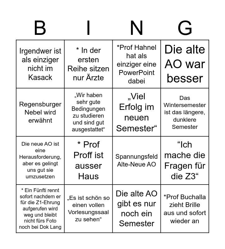 This bingo card has 16 words: „Es ist schön so einen vollen Vorlesungssaal zu sehen“, “Ich mache die Fragen für die Z3“, *Prof Hahnel hat als einziger eine PowerPoint dabei, Irgendwer ist als einziger nicht im Kasack, Die neue AO ist eine Herausforderung, aber es gelingt uns gut sie umzusetzen, * In der ersten Reihe sitzen nur Ärzte, Spannungsfeld Alte-Neue AO, Die alte AO gibt es nur noch ein Semester, Regensburger Nebel wird erwähnt, „Wir haben sehr gute Bedingungen zu studieren und sind gut ausgestattet“, * Ein Fünfti rennt sofort nachdem er für die Z1-Ehrung aufgerufen wird weg und bleibt nicht fürs Foto noch bei Dok Lang, Die alte AO war besser, * Prof Proff ist ausser Haus, Das Wintersemester ist das längere, dunklere Semester, „Viel Erfolg im neuen Semester“ and *Prof Buchalla zieht Brille aus und sofort wieder an.