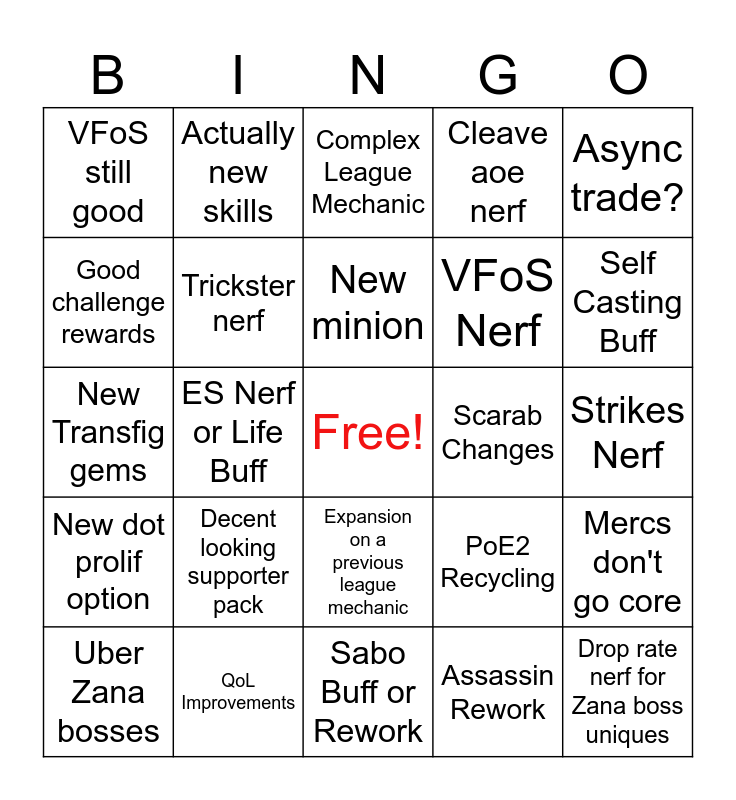 This bingo card has a free space and 24 words: Decent looking supporter pack, QoL Improvements, New minion, Uber Zana bosses, Async trade?, VFoS still good, Good challenge rewards, Actually new skills, Scarab Changes, Expansion on a previous league mechanic, VFoS Nerf, New Transfig gems, PoE2 Recycling, Mercs don't go core, Trickster nerf, Assassin Rework, Strikes Nerf, Complex League Mechanic, Self Casting Buff, ES Nerf or Life Buff, Drop rate nerf for Zana boss uniques, New dot prolif option, Cleave aoe nerf and Sabo Buff or Rework.