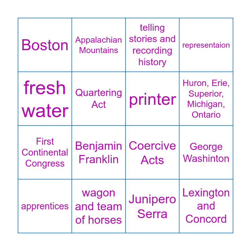 This bingo card has 16 words: wagon and team of horses, George Washinton, telling stories and recording history, Boston, First Continental Congress, Appalachian Mountains, Coercive Acts, Junipero Serra, fresh water, Quartering Act, apprentices, representaion, Benjamin Franklin, Huron, Erie, Superior, Michigan, Ontario, printer and Lexington and Concord.