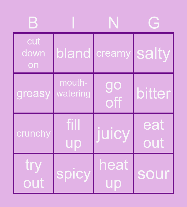 This bingo card has 16 words: spicy, eat out, creamy, cut down on, crunchy, bland, juicy, heat up, greasy, mouth-watering, try out, salty, fill up, bitter, go off and sour.