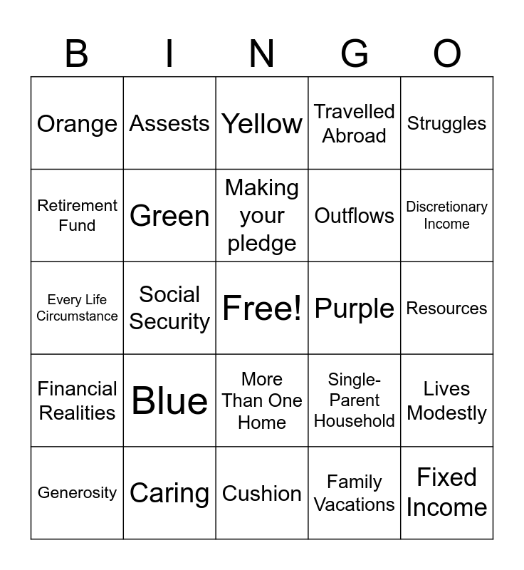 This bingo card has a free space and 29 words: Generosity, Hospice Care, Social Security, Red, Orange, Yellow, Green, Blue, Purple, Caring, Resources, Fixed Income, Cushion, Family Vacations, Discretionary Income, Secure Finances, More Than One Home, Financial Realities, Struggles, Every Life Circumstance, Single-Parent Household, Underemployed, Outflows, Retirement Fund, Travelled Abroad, Assests, Lives Modestly, Making your pledge and Guide.