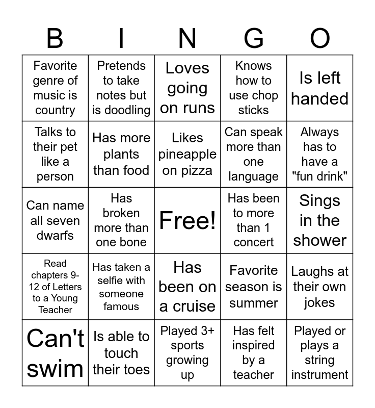 This bingo card has a free space and 24 words: Can't swim, Has taken a selfie with someone famous, Likes pineapple on pizza, Has felt inspired by a teacher, Is left handed, Favorite genre of music is country, Pretends to take notes but is doodling, Loves going on runs, Has been to more than 1 concert, Sings in the shower, Can name all seven dwarfs, Has more plants than food, Favorite season is summer, Laughs at their own jokes, Talks to their pet like a person, Is able to touch their toes, Played 3+ sports growing up, Knows how to use chop sticks, Always has to have a "fun drink", Read chapters 9-12 of Letters to a Young Teacher, Has broken more than one bone, Has been on a cruise, Can speak more than one language and Played or plays a string instrument.