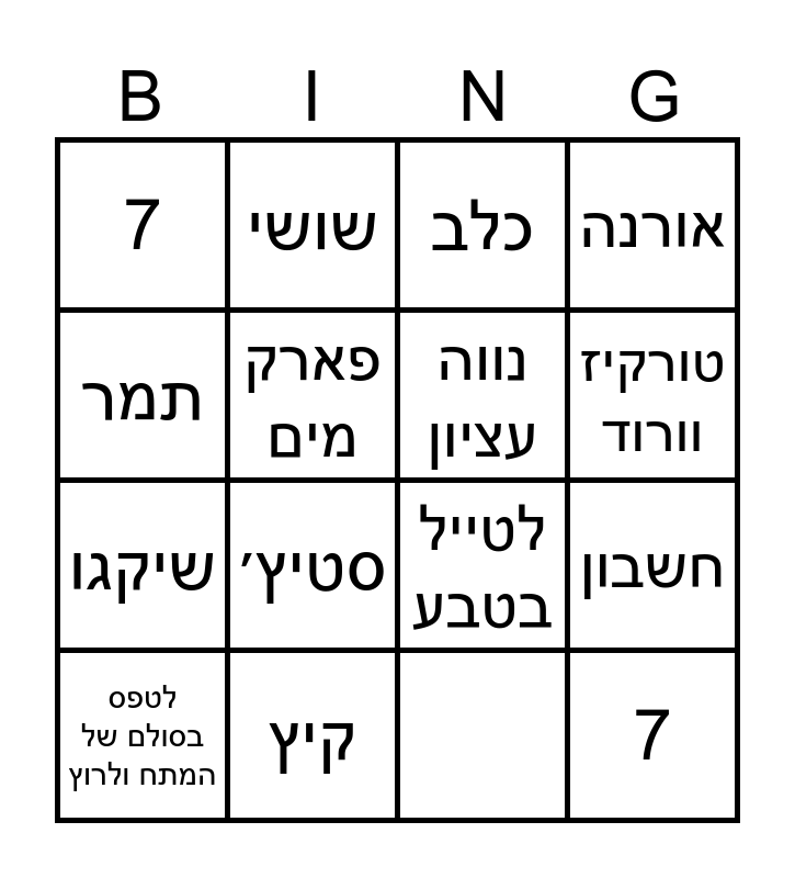 This bingo card has 16 words: Free!, 7, 7, שושי, נווה עציון, אורנה, שיקגו, סטיץ׳, כלב, טורקיז וורוד, לטפס בסולם של המתח ולרוץ, פארק מים, לטייל בטבע, חשבון, תמר and קיץ.