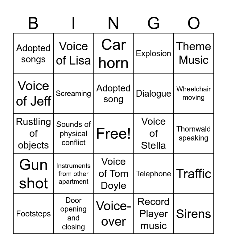 This bingo card has a free space and 24 words: Instruments from other apartment, Door opening and closing, Adopted song, Footsteps, Theme Music, Adopted songs, Voice of Jeff, Voice of Lisa, Voice of Stella, Voice of Tom Doyle, Dialogue, Rustling of objects, Telephone, Traffic, Screaming, Record Player music, Thornwald speaking, Car horn, Wheelchair moving, Sounds of physical conflict, Sirens, Gun shot, Explosion and Voice-over.