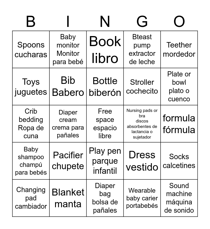 This bingo card has a free space and 24 words: Pacifier chupete, Blanket manta, Bottle biberón, Changing pad cambiador, Teether mordedor, Spoons cucharas, Toys juguetes, Baby monitor Monitor para bebé, Nursing pads or bra discos absorbentes de lactancia o sujetador, Play pen parque infantil, Stroller cochecito, Crib bedding Ropa de cuna, Dress vestido, Socks calcetines, Bib Babero, Wearable baby carier portabebés, formula fórmula, Book libro, Plate or bowl plato o cuenco, Diaper cream crema para pañales, Sound machine máquina de sonido, Baby shampoo champú para bebés, Bteast pump extractor de leche and Diaper bag bolsa de pañales.