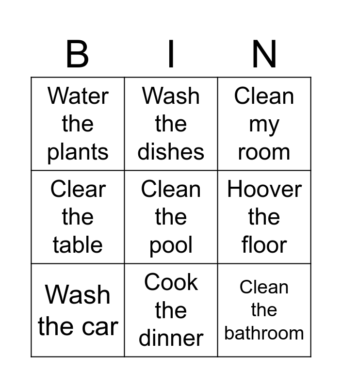 This bingo card has 12 words: Free!, Clean the bathroom, Clean the pool, Hoover the floor, Wash the dishes, Clean my room, Cook the dinner, Load the dishwasher, Water the plants, Clear the table, Wash the car and Make the bed.