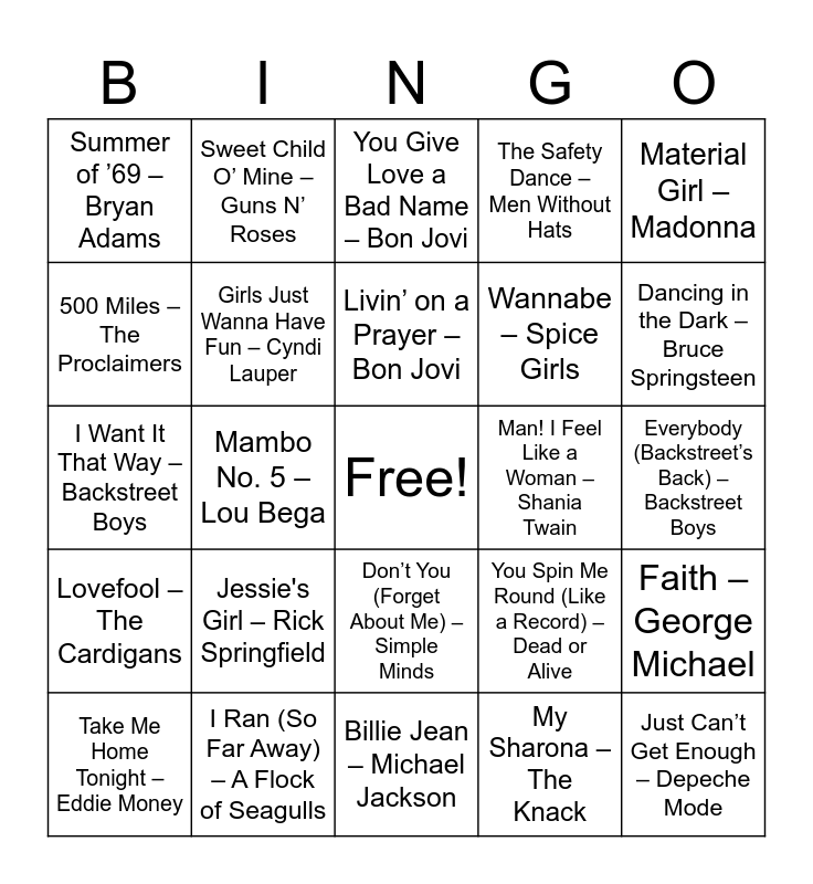 This bingo card has a free space and 25 words: Jessie's Girl – Rick Springfield, Billie Jean – Michael Jackson, Livin’ on a Prayer – Bon Jovi, Take Me Home Tonight – Eddie Money, Material Girl – Madonna, Summer of ’69 – Bryan Adams, 500 Miles – The Proclaimers, Sweet Child O’ Mine – Guns N’ Roses, Man! I Feel Like a Woman – Shania Twain, Don’t You (Forget About Me) – Simple Minds, Wannabe – Spice Girls, I Want It That Way – Backstreet Boys, You Spin Me Round (Like a Record) – Dead or Alive, Faith – George Michael, Girls Just Wanna Have Fun – Cyndi Lauper, Smooth – Santana ft. Rob Thomas, Everybody (Backstreet’s Back) – Backstreet Boys, You Give Love a Bad Name – Bon Jovi, Dancing in the Dark – Bruce Springsteen, Mambo No. 5 – Lou Bega, Just Can’t Get Enough – Depeche Mode, I Ran (So Far Away) – A Flock of Seagulls, Lovefool – The Cardigans, The Safety Dance – Men Without Hats and My Sharona – The Knack.