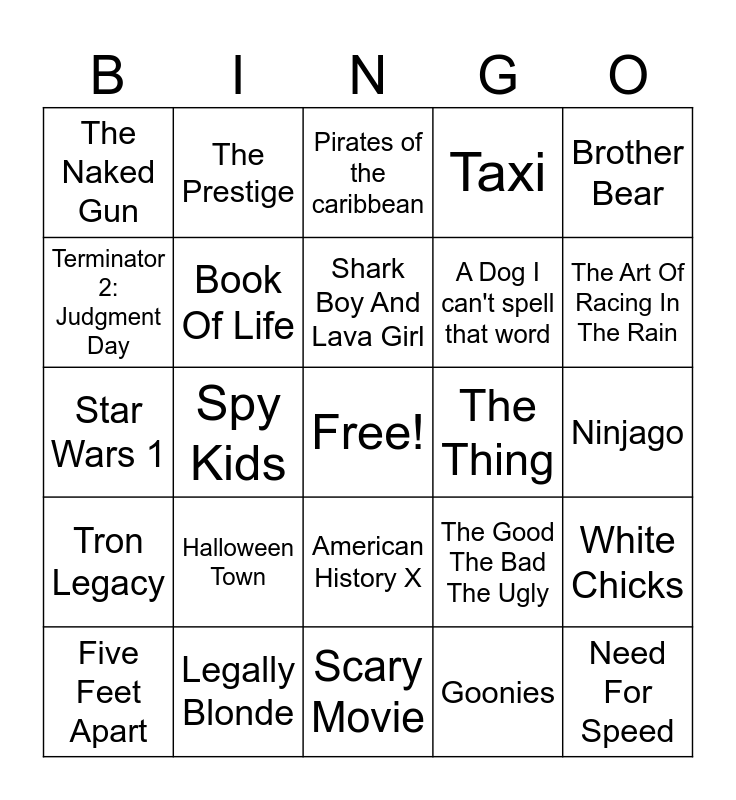 This bingo card has a free space and 24 words: Halloween Town, Legally Blonde, Shark Boy And Lava Girl, Five Feet Apart, Brother Bear, The Naked Gun, Terminator 2: Judgment Day, The Prestige, The Thing, American History X, A Dog I can't spell that word, Star Wars 1, The Good The Bad The Ugly, White Chicks, Book Of Life, Goonies, Ninjago, Pirates of the caribbean, The Art Of Racing In The Rain, Spy Kids, Need For Speed, Tron Legacy, Taxi and Scary Movie.