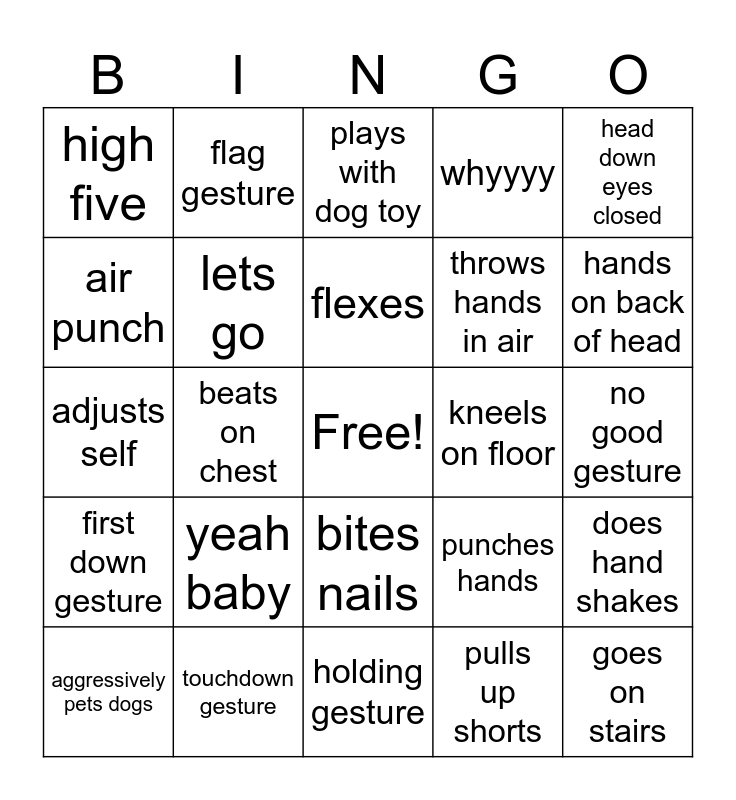 This bingo card has a free space and 24 words: yeah baby, touchdown gesture, flexes, aggressively pets dogs, head down eyes closed, high five, air punch, flag gesture, kneels on floor, bites nails, throws hands in air, adjusts self, punches hands, does hand shakes, lets go, pulls up shorts, no good gesture, plays with dog toy, hands on back of head, beats on chest, goes on stairs, first down gesture, whyyyy and holding gesture.