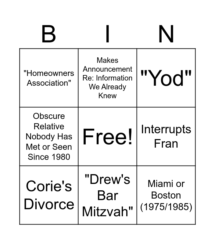 This bingo card has a free space and 8 words: Interrupts Fran, "Yod", Makes Announcement Re: Information We Already Knew, Corie's Divorce, "Homeowners Association", Miami or Boston (1975/1985), Obscure Relative Nobody Has Met or Seen Since 1980 and "Drew's Bar Mitzvah".
