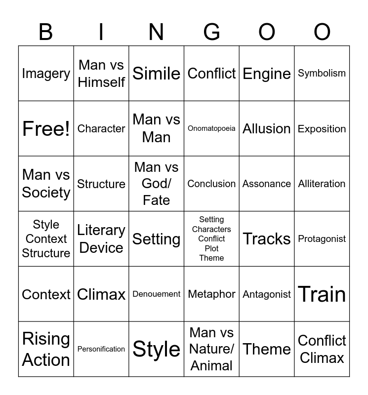 This bingo card has 36 words: Style Context Structure, Literary Device, Style, Onomatopoeia, Assonance, Alliteration, Imagery, Personification, Simile, Metaphor, Allusion, Symbolism, Context, Structure, Man vs Man, Conflict, Antagonist, Protagonist, Free!, Character, Setting, Setting Characters Conflict Plot Theme, Tracks, Train, Man vs Society, Man vs Himself, Man vs God/ Fate, Man vs Nature/ Animal, Engine, Exposition, Rising Action, Climax, Denouement, Conclusion, Theme and Conflict Climax.