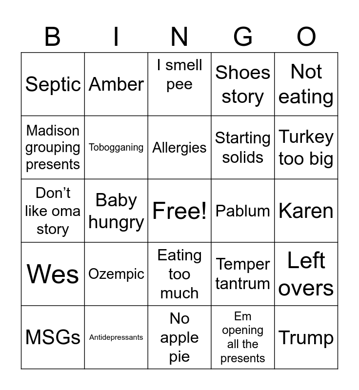 This bingo card has a free space and 24 words: Ozempic, Antidepressants, Allergies, MSGs, Not eating, Septic, Madison grouping presents, Amber, Pablum, Eating too much, Starting solids, Don’t like oma story, Temper tantrum, Left overs, Tobogganing, Em opening all the presents, Karen, I smell pee, Turkey too big, Baby hungry, Trump, Wes, Shoes story and No apple pie.